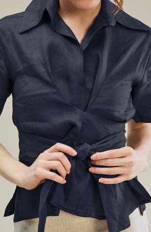 This Ashley shirt is made from 100% Linen and is inspired by our Arthur Dress. This shirt features belts at the front that wraps around the waist and pleated sleeve detail. Wear it with wide-leg pants or a pair of denims.