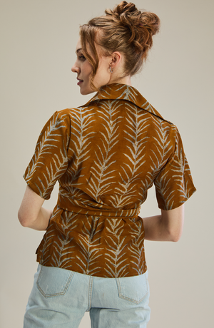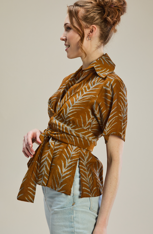 This Ashley shirt is inspired by our Arthur Dress. This shirt features belts at the front that wraps around the waist and pleated sleeve detail. Wear it with wide-leg pants or a pair of denims.