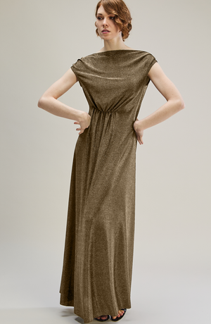 The Grace Dress combines elegance and ease with its shimmering gold stretch fabric and flowing silhouette. Featuring a flattering gathered waist, boat neckline, and soft cap sleeves, it’s finished with a draped cowl back for a touch of glamour. Perfect for evening occasions and special events.