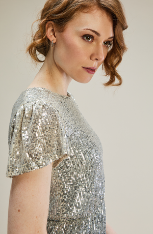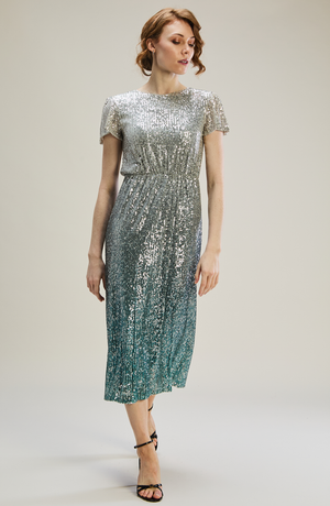 Our Liz Dress is cut from mesh drenched in a ombré sequins that are sure to sparkle from every angle. This dress is fully lined with a smooth fabric, it has shoulder pads, a key-hole at back and flared sleeves.
